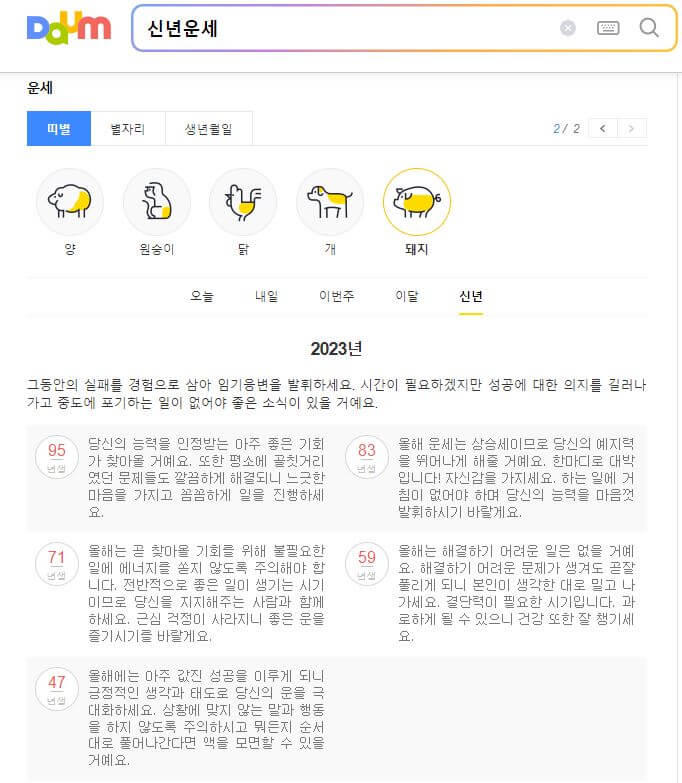 간단하게 해당되는 띠를 고르시면 연도 별로 운세가 나와 있습니다.